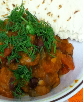 In a medium/large pot heat the oil over low heat. Dice onion and bell pepper, mince garlic. Add to the pot and turn the heat up to medium. Saute until onion begins to soften. Chop chipotle pepper and add to the pot, if you like it spicy add a little of the sauce too. Add diced tomatoes with juices, pumpkin and all the spices and cook for 2-3 minutes. Drain and rinse the bean and add to the pot. Once everything is warmed through check to see if you need to add any salt or pepper.